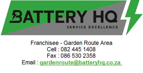 As part of our aim to grow our business we have acquired a Battery HQ franchise for the Garden Route area. Our main goal is to supply products at affordable pricing and to deliver excellent service. Because of being in business for the past 25 years as a family, we have learned to treat clients with respect and to go out of our way to make sure that they experience customer satisfaction. Vehicles form a integral part of any society and the majority of families depend on them for transport to work, getting children to school and even leisure. Healthy batteries are therefor critical to ensure save and sound travelling.